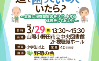 山陽小野田市中央図書館で「第16回共生のまちづくり講座 もし、道で困っている人がいたら?」が3月29(日)に開かれます。参加無料。グループ...
