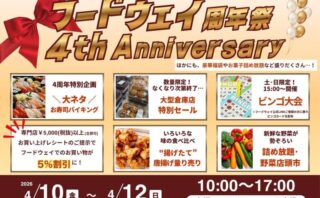 おのだサンパークで「フードウェイ周年祭 4th Anniversary」が4月11(土)、12(日)に開催されます。・大人気「お寿司バイキ...