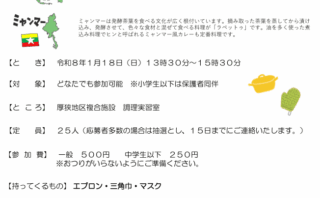 1月教室のテーマは「外国の料理を作ろう!」で、今回はタイのカオマンガイとミャンマーのラペットゥに挑戦するようです。 小学生は保護者同伴。参加費は一般500円、中...