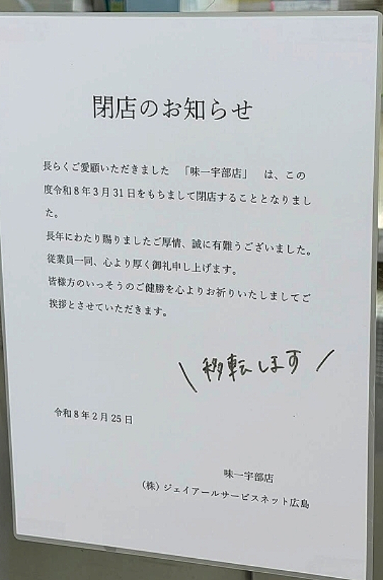 【移転】JR宇部駅の改札外、構内にある駅うどん・そば屋「味一 宇部店」2026年3月31日をもって閉店→移転 NEW 開店・閉店 2026.03.01 JR宇部駅の改札外、構内にある駅うどん・そば屋「味一 宇部店」 2026年3月31日をもって閉店し移転されるそうです。 味一 宇部店宇部市西宇部南4-4-18 JR宇部駅営業時間 5:00〜14:00