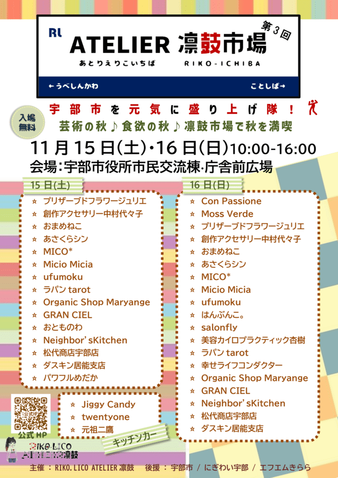 宇部市役所市民交流棟(交流ホール)・庁舎前広場で「ATELIER凛鼓市場」が11月15(土) 、11月16(日)に開催されます。