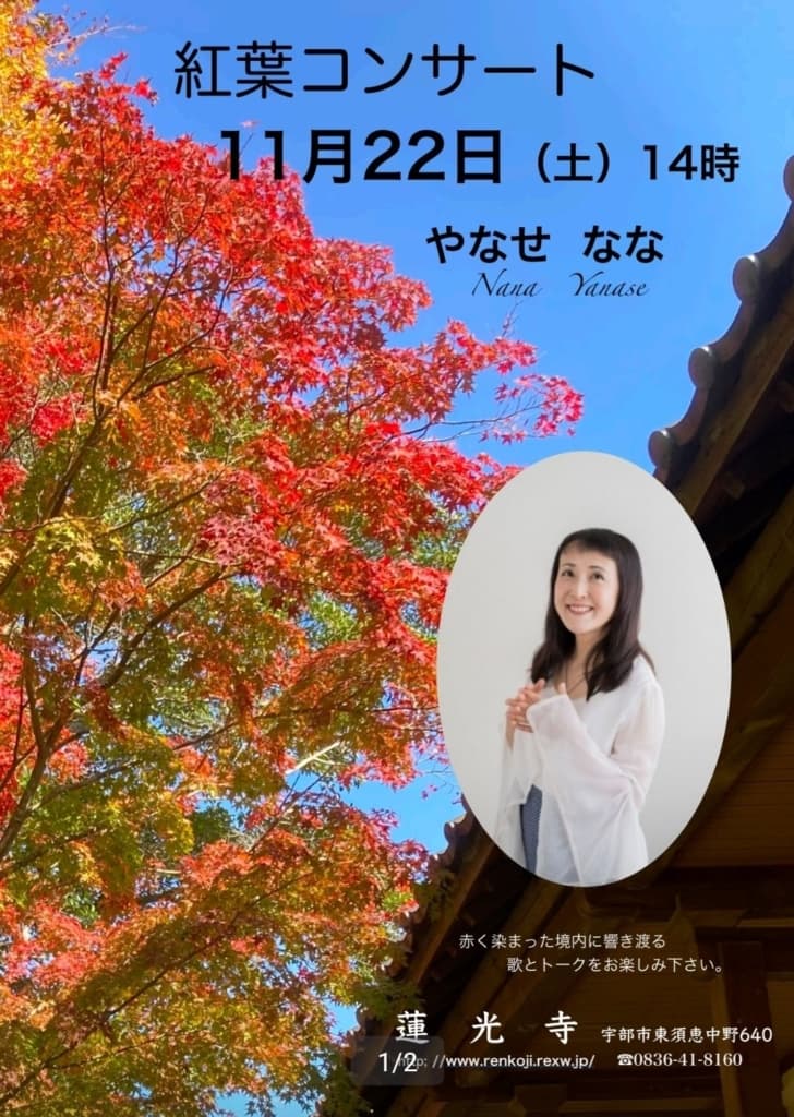 宇部市・蓮光寺で「やなせななさんの紅葉コンサート」が11月22(土)に開催されます🍁