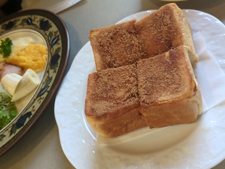 シナモントーストは分厚くて、中がきめ細かくふわふわ、しっとり。