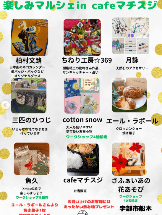 宇部市船木「楽しみマルシェ in cafeマチスジ」2025年12月20(土)開催! 2025.12.02 宇部市船木cafeマチスジで「楽しみマルシェ in cafeマチスジ」が12月20(土)に開催されます。 この投稿をInstagramで見る @tanoshimimarcheがシェアした投稿 楽しみマルシェ in cafeマチスジ場所 cafeマチスジ時間 10:00~15:00
