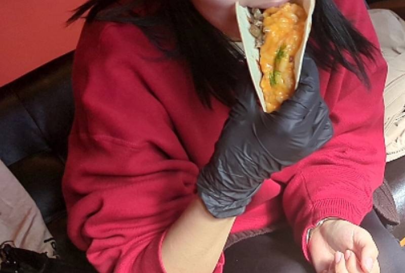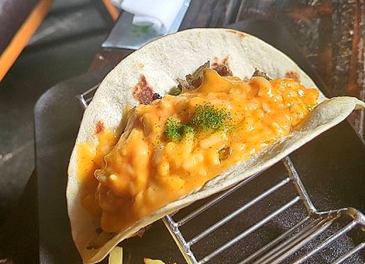 チーズタコスは100%の牛ミンチに濃厚なチーズが沢山かかっていてタコスの生地は香ばしい。食べにくそうに見えますが、手袋もあり、タコスの生地も柔らかく、食べやすかったです。