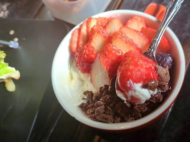 12時半に店主が帰ってこられ、クリークヨーグルトを注文すると、お詫びにいちご増量しますねと言ってくださりました。