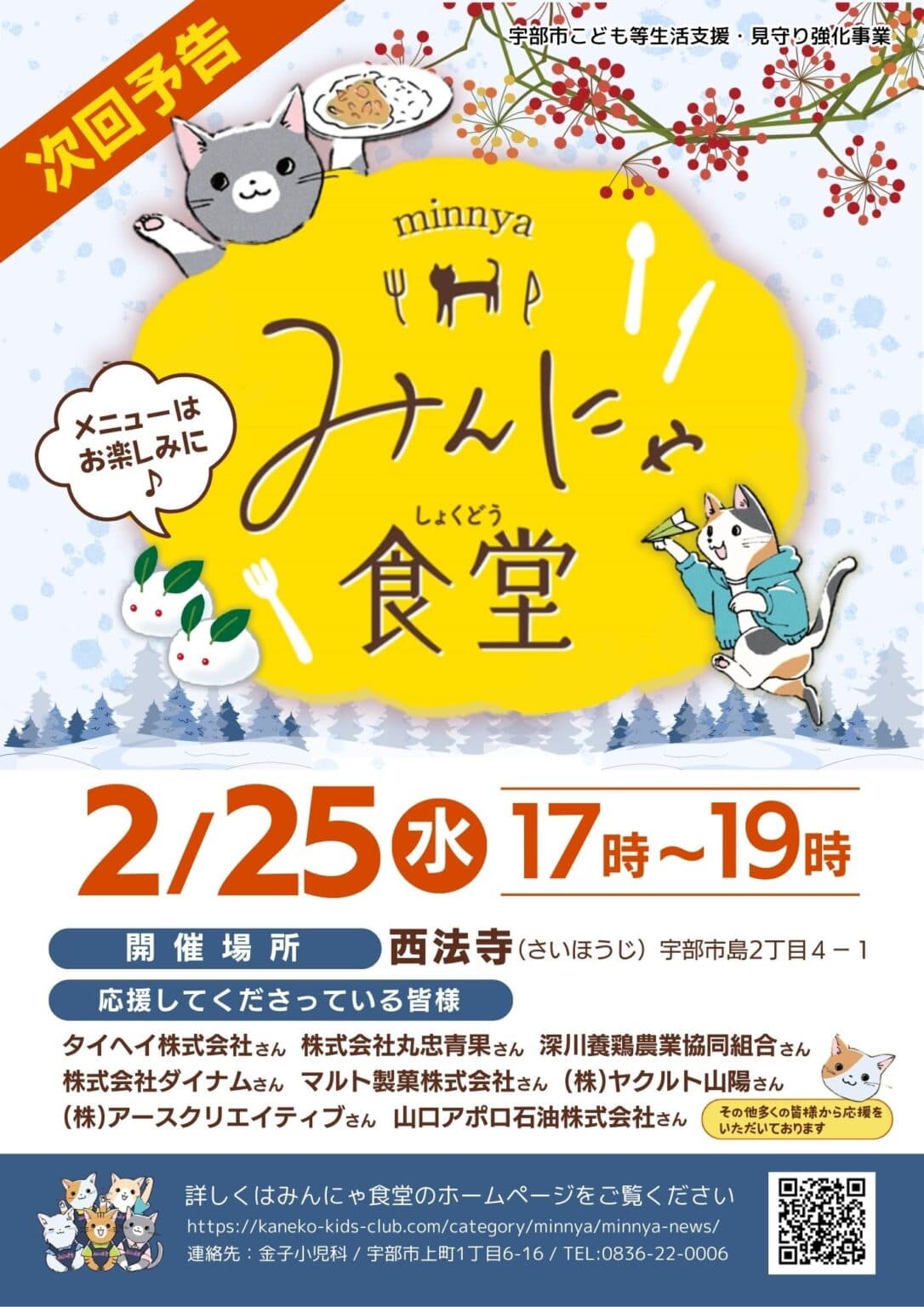 西法寺「みんにゃ食堂」2026年2月25(水)開催! NEW まち 2026.02.23 「みんにゃ食堂」が西法寺で2月25(水)に開催♪ メニューはお楽しみです♪ みんにゃ食堂西法寺日時 2月25(水)17:00~19:00