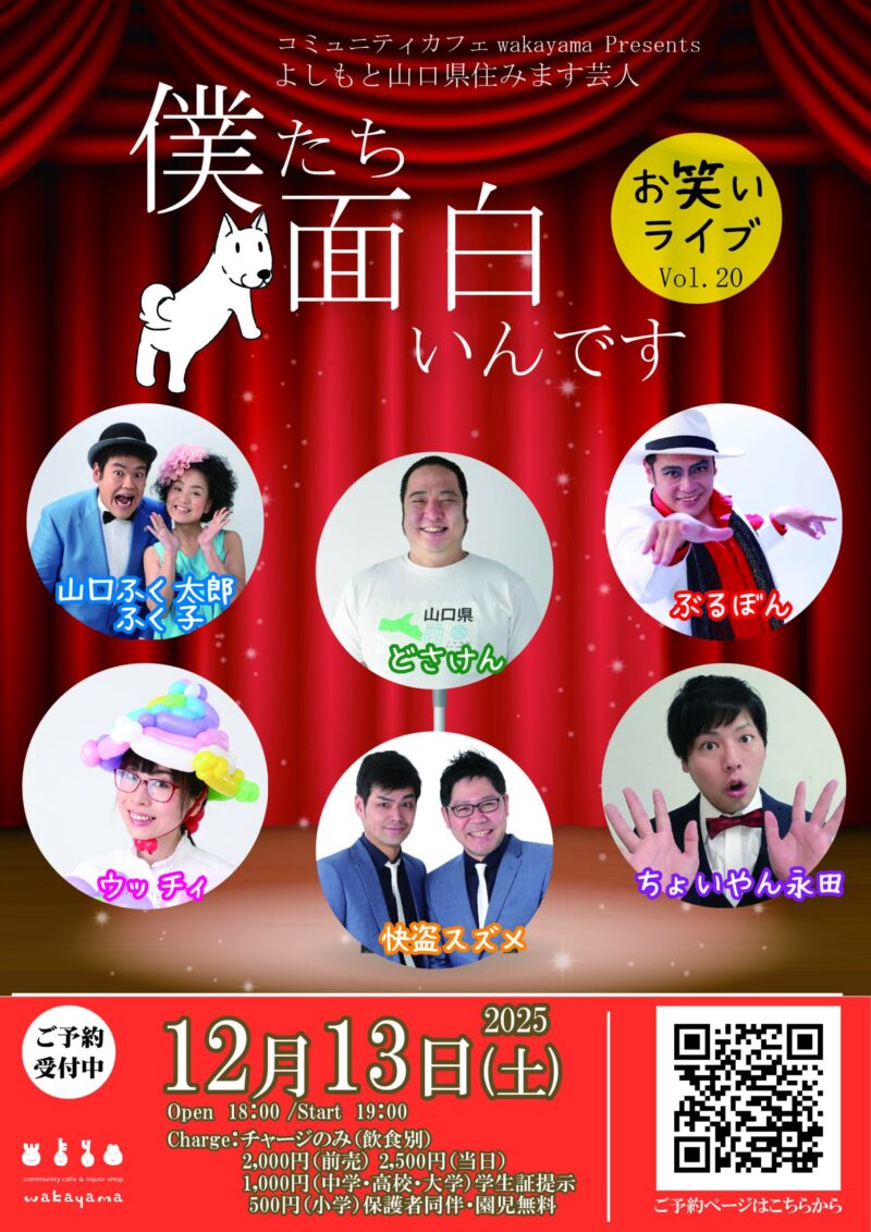 山陽小野田市コミニティーカフェwakayamaで「お笑いライブvol.20僕たち面白いんです」が12月13(土)に開催されます。
