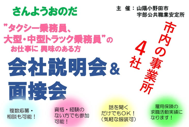 求人市内の事業所4社がご来場し、タクシー乗務員、大型・中型トラック乗務員の「さんようおのだ 会社説明会&面接会」が年3月5(木)に山陽小野田市Aスクエアにて開催されます。