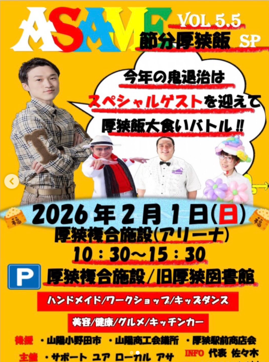 厚狭複合施設で「大食いバトル×お笑いライブ」が2月1(日)に開催されます。