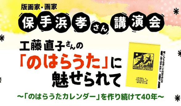 詩人・童話作家 工藤直子さんの詩集「のはらうた」を基にカレンダーの原画を作り続けている山口市在住の版画家・画家の保手浜 孝(ほてはま たかし)さんを迎えて、講演を開催します。