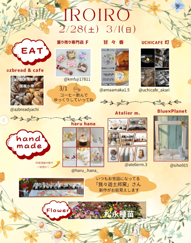 山陽小野田市「IRO_IROマルシェ」2026年2月28(土)、3月1(日)開催! イベント 2026.02.19 山陽小野田市で「IRO_IROマルシェ」が2月28(土)、3月1(日)に開催されます。 出展者など詳しくはInstagramからご確認ください。 この投稿をInstagramで見る Atelier m.(@atelierm.3)がシェアした投稿 IRO_IROマルシェ山陽小野田市東高泊1337‐23日時 2月28(日)Instagram
