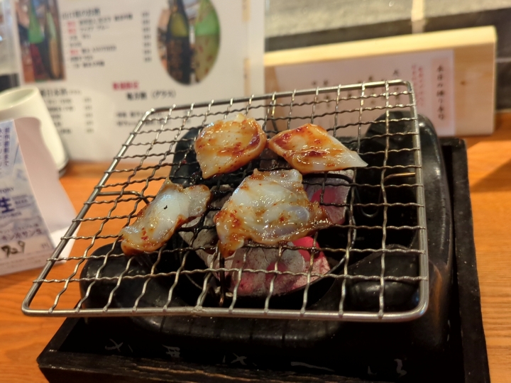 瀬戸内地たこピリ辛炭焼(899円)。表面を15秒ずつさっと炭火で炙ります。