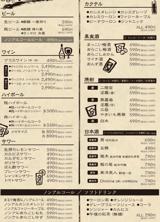 営業時間 18:00~24:00(フードラスト23時15分 ドリンクラスト23時30分)