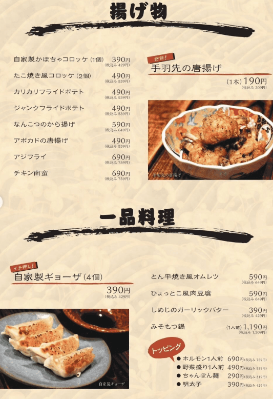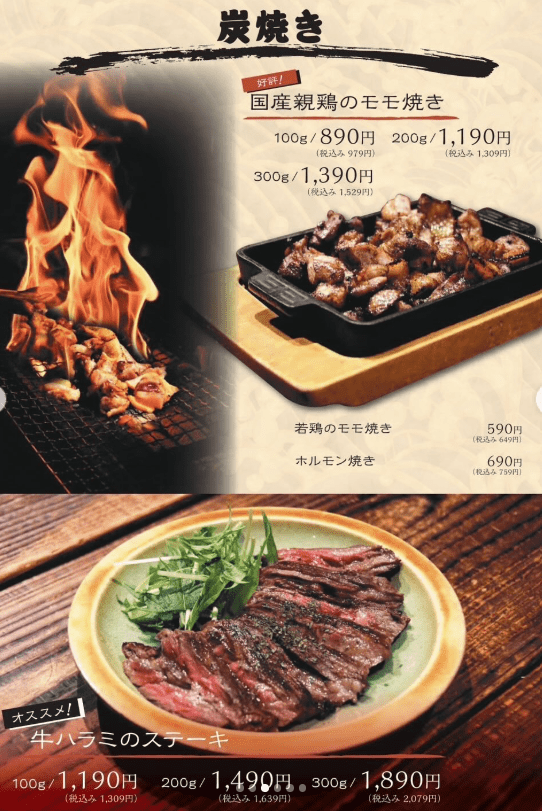 肉料理が自慢の居酒屋。生まれも育ちも山口県で、和・洋の創作料理の経験を長く積んだ店主が腕を振るう「親鳥のもも焼き」や「牛ハラミのステーキ」など、多彩なお肉メニュー。
