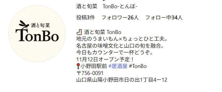 【開店】山陽小野田市「酒と旬菜 TonBo」2025年11月12(水)オープン✨ 2025.11.12 山陽小野田市日の出に「酒と旬菜 TonBo」が11月12(水)オープン✨ インスタグラムも立ち上がっていました▼ この投稿をInstagramで見る 酒と旬菜 TonBo-とんぼ-(@sake_syunsai_tonbo)がシェアした投稿 この投稿をInstagramで見る 酒と旬菜 TonBo-とんぼ-(@sake_syunsai_tonbo)がシェアした投稿 酒と旬菜 TonBo山陽小野田市日の出1丁目4ー12営業時間 16:00〜0:00Instagram