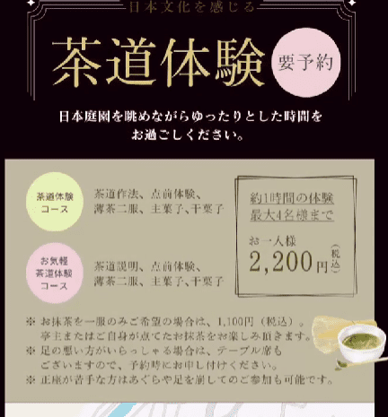 和の空間で静かな日本庭園を眺めながら、初めてでも安心の茶道体験。主菓子・干菓子と共に、自分で点てる一服をいただけるようです。