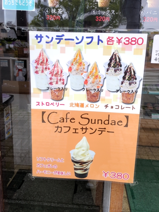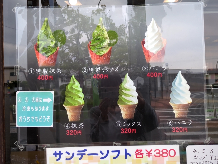 カップとコーンで選べ、バニラや抹茶とのミックスもあります。