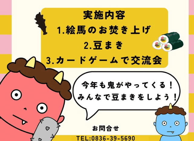 宇部市若者フリースペース「節分の日 豆まき大会」2026年2月1(日)開催! イベント 2026.01.21 宇部市若者フリースペースで「節分の日 豆まき大会」が2月1(日)開催されます。 対象は若者フリースペースを利用している中高生。 絵馬のお焚き上げ、豆まき、カードゲームをみんなで楽しもう♪ 申込は若者フリースペースの受付、電話、InstagramのDMから。また当日飛び入り参加も大歓迎だそうですよ♪ この投稿をInstagramで見る 宇部市 | 若者ふりースペース | ボスティビルド3F(@ube_city.wakamono.freespace)がシェアした投稿 節分の日 豆まき大会宇部市若者フリースペース日時 2月1(日)13:00~17:00Instagram