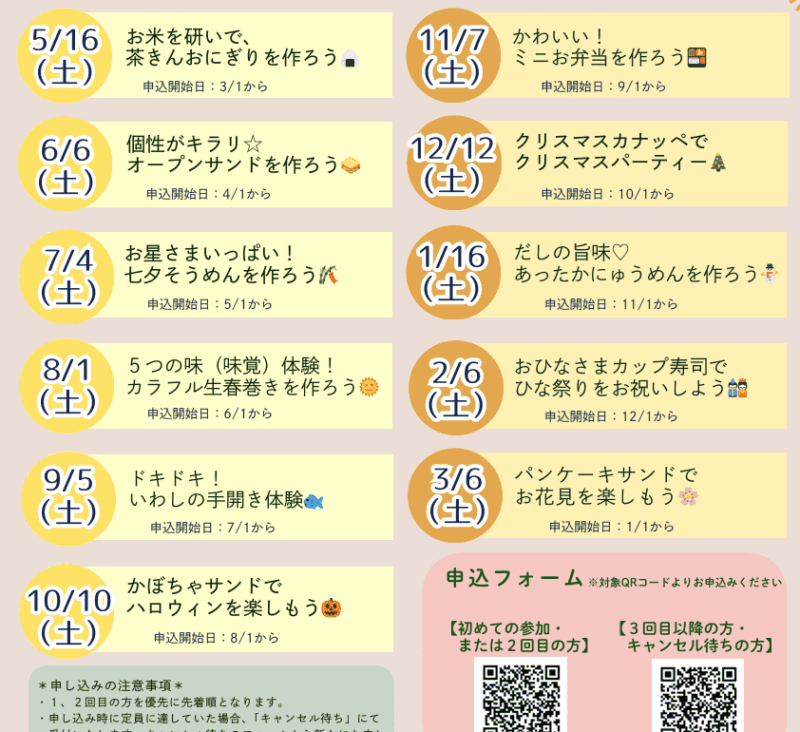 親子で簡単な調理体験や試食をしながら、楽しく食について学びます♪お子さんが、じっとしていられなくてもご心配なく♪お子さんと一緒にお気軽にご参加下さい。