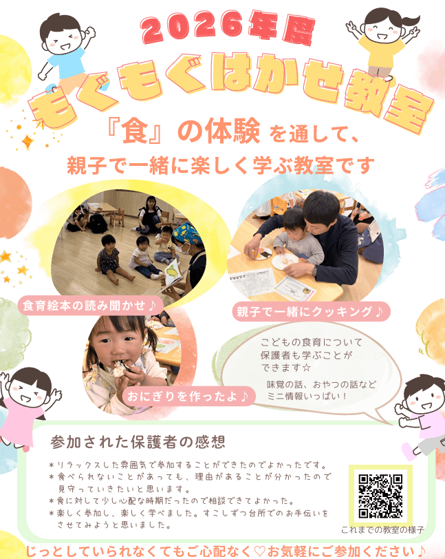 親子で簡単な調理体験や試食をしながら、楽しく食について学びます♪お子さんが、じっとしていられなくてもご心配なく♪お子さんと一緒にお気軽にご参加下さい。