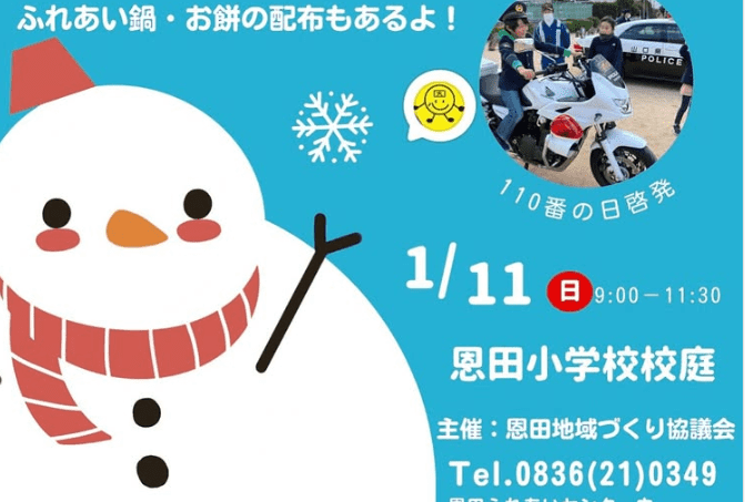 恩田小学校校庭「おんだふれあい冬まつり」2026年1月11(日) 2025.12.26 恩田小学校校庭で「おんだふれあい冬まつり」が1月11(日)に開催されます。 どんと焼きやバザー、遊びコーナーにふれあい鍋、お餅の配布もあるそうです この投稿をInstagramで見る 恩田地域づくり(@ondachiiki)がシェアした投稿 おんだふれあい冬まつり恩田小学校校庭日時 1月11(日)9:00~11:30