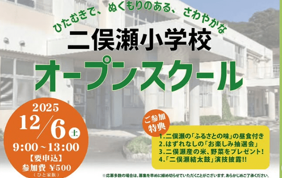 【要申込】「二俣瀬小学校 オープンスクール」2025年12月6(土) 2025.11.16 宇部市立二俣瀬小学校で「二俣瀬小学校 オープンスクール」が12月6(土)に行われます。 学校の授業の体験をしてみよう。 二俣瀬の「ふるさとの味」昼食付き! ※未就児〜小学生対象。 ※要申込(申込はコチラまたはInstagramのDMまたは二俣瀬小学校中谷校長先生まで)参加費500円(ひと家族) この投稿をInstagramで見る 宇部市立二俣瀬小学校(@futamatasesho.since1873)がシェアした投稿 二俣瀬小学校 オープンスクール場所 宇部市立二俣瀬小学校日時 2025年12月6(土) 9:00~13:00※要申込※未就児〜小学生対象
