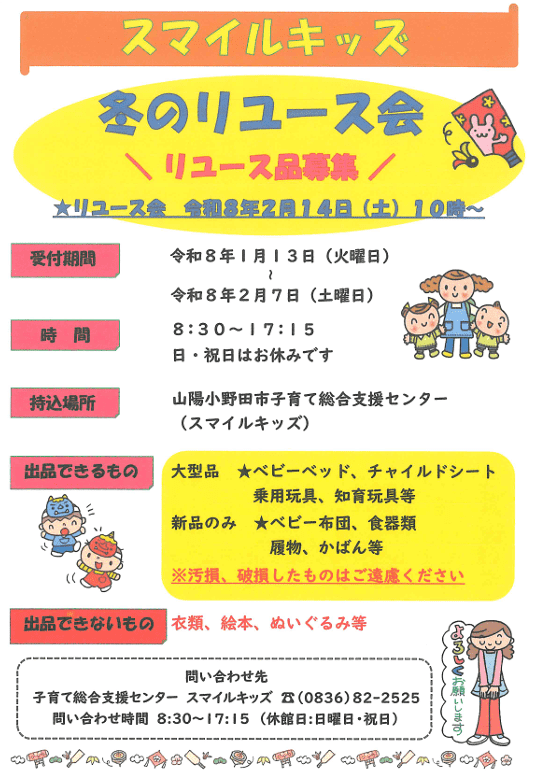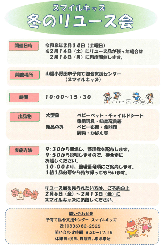 山陽小野田市子育て総合支援センター スマイルキッズで「冬のリユース会」が2月14(土)2月16(月)に開催されます。