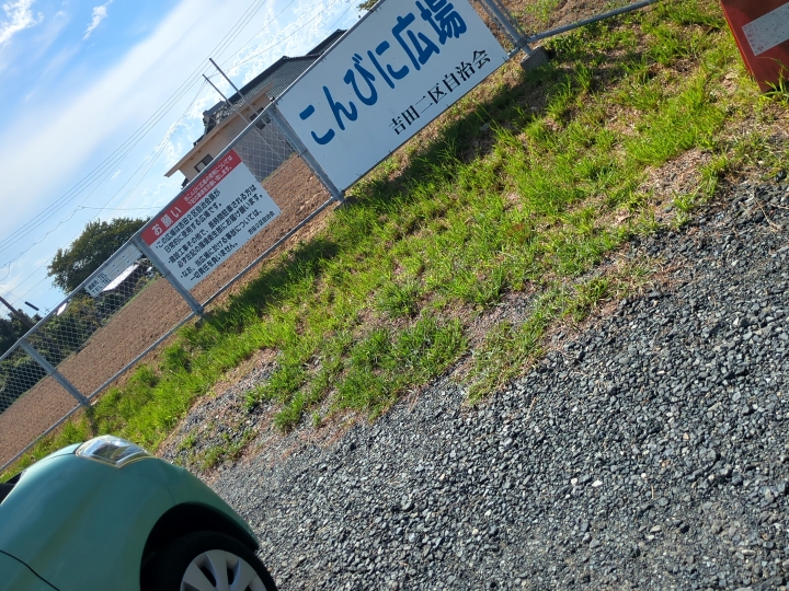 駐車場はお店の前の「こんびに広場」に停めました。フェンスに近い場所に停めます。