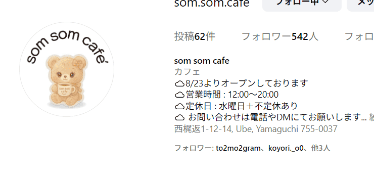 宇部市参宮通りに韓国風Cafe「som som cafe」2025年8月オープン✨ グルメ 2025.08.312025.10.23 宇部市参宮通りに韓国風Cafe「som som cafe」が8月オープン✨ 白を基調にした可愛い店内でスイーツ、ドリンクと一緒に癒されませんか? 駐車場は隣モスバーガー前の1,5,7番です。(インスタグラムに掲載) メニューはインスタグラムに沢山掲載されています↓ この投稿をInstagramで見る som som cafe(@som.som.cafe)がシェアした投稿 この投稿をInstagramで見る som som cafe(@som.som.cafe)がシェアした投稿 この投稿をInstagramで見る som som cafe(@som.som.cafe)がシェアした投稿 この投稿をInstagramで見る som som cafe(@som.som.cafe)がシェアした投稿 この投稿をInstagramで見る som som cafe(@som.som.cafe)がシェアした投稿 この投稿をInstagramで見る som som cafe(@som.som.cafe)がシェアした投稿 som som cafe宇部市西梶返1-12-14電話090-1957-3636営業時間 12:00~20:00定休日 水、不定休ありインスタグラムをご確認下さい