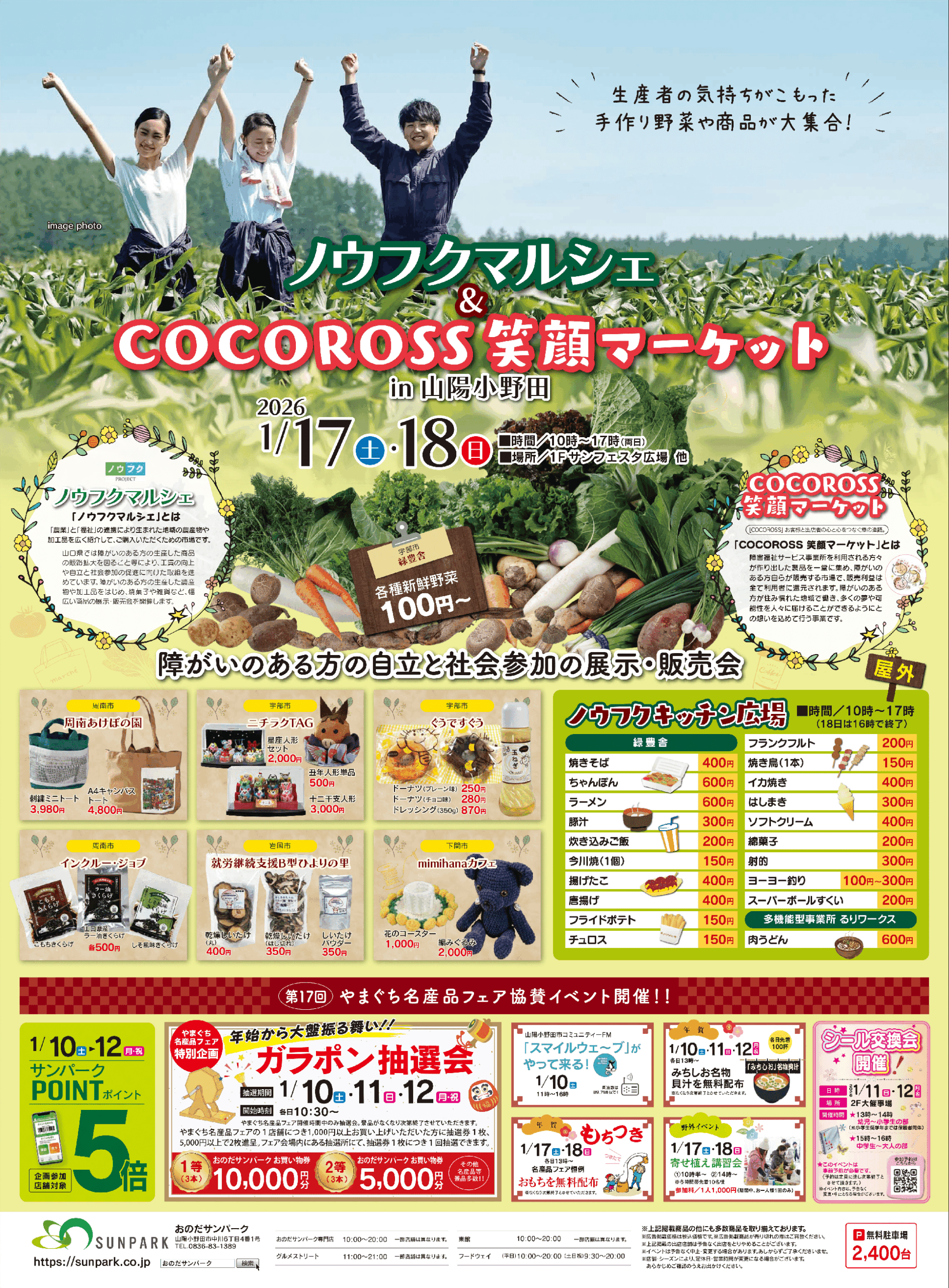 おのだサンパークで「ノウフクマルシェ&cocoross笑顔マーケット」が1月17(土)18(日)開催!